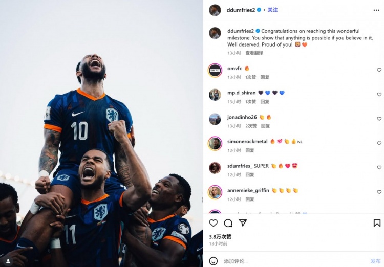 赛后邓弗里斯在社交媒体发布德佩庆祝照片并配文:“祝贺达成这一非凡成就。你证明了坚信自我便能创造奇迹。这份荣誉实至名归,为你感到自豪!🦁🧡”