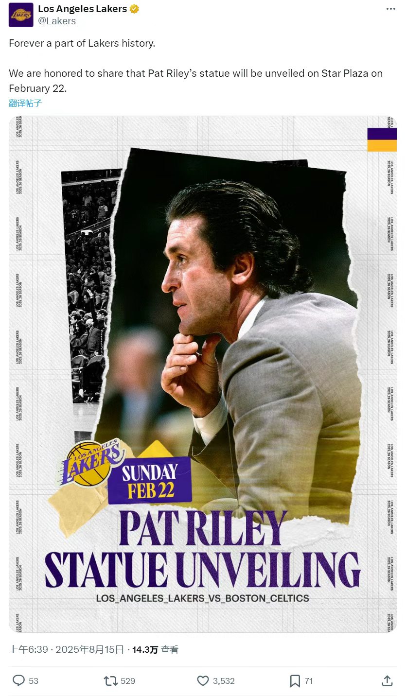洛杉矶湖人官方宣布,球队将在当地时间 2026 年 2 月 22 日主场对阵凯尔特人的比赛期间,为帕特 - 莱利的雕像揭幕。这一消息让不少球迷疑惑:莱利如今是热火总经理,湖人为何要为他树碑立传?