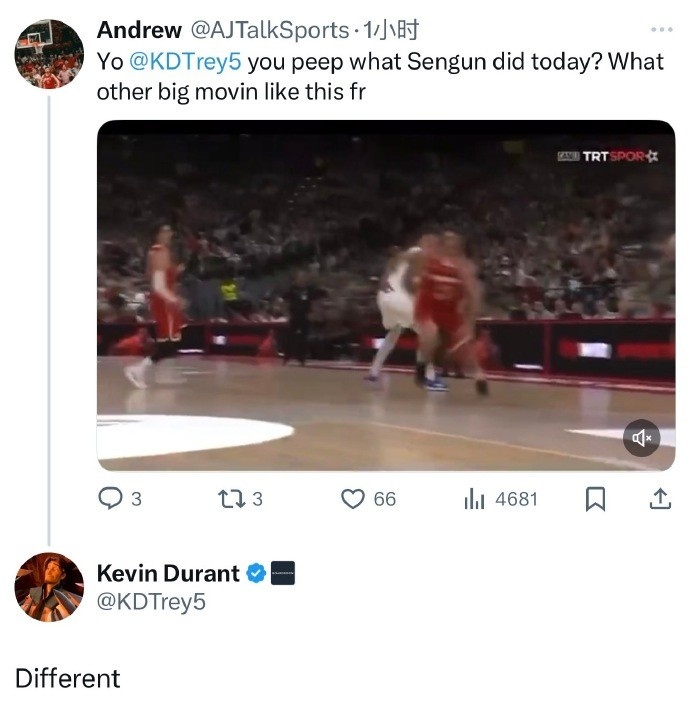 一位球迷转发申京本场丝滑转身突破暴扣视频并喊话杜兰特:“哟KD,你看到申京今天的表现了吗?还有哪个大个子能像他这样移动啊,真的牛。”