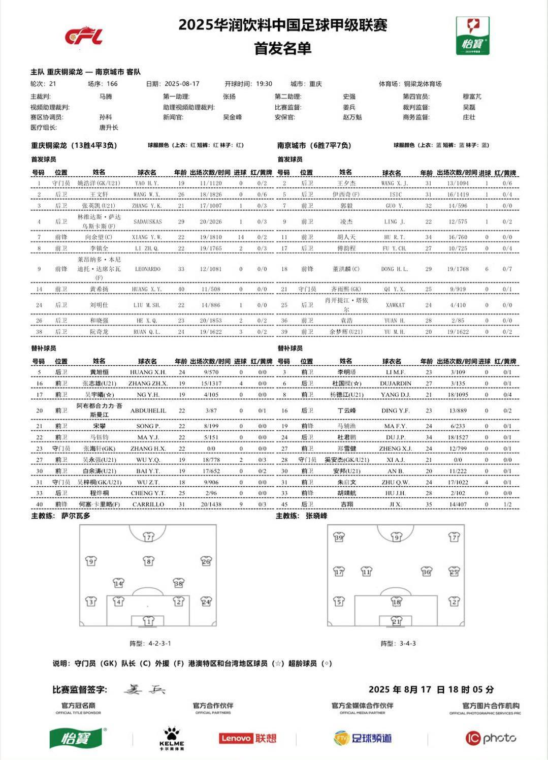 俱乐部足球-重庆vs南京:双外援PK单外援,向余望、阮奇龙、凌杰出战 2025-08-19 08:02:20 nba 116℃ 0 北京时间8月17日19:30,中甲第21轮,重庆铜梁龙主场迎战南京城市。赛前,双方首发公布如下: 上一篇:FIFA俱乐部世界杯-中国女子五人制足球亚洲杯吉祥物、口号发布,吉祥物昵称“雁翎” 下一篇:官方指定-德甲彩经:保级成功 霍芬海姆客场取分 相关推荐 官方投注-梅西采访是欲拒还留还是告别?一切都还是个谜 2025世俱杯-最年轻15000分先生!幼詹26岁前达成历史唯一 三少领衔现役11人 世俱杯官网-勇士主场迎战奇才 梅尔顿出战成疑 库里&霍福德等6大将缺席 FIFA俱乐部世界杯-布朗:欧文&海沃德加盟后我只能替补 但我没公开诉苦也没申请交易