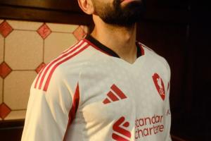 客场球衣则延续利物浦经典的客场配色,以奶油白为主色,缀以黑红双色细节作为点睛。队徽创新采用盾形框架设计,利弗鸟坐落于盾牌之中,其轮廓灵感源自1906年安菲尔德主看台建筑结构,通过当代手法重构历史图腾。客场球衣有两套搭配方案——黑色球裤搭配奶油白球袜与奶油白球裤搭配黑色球袜,满足多元风格表达
